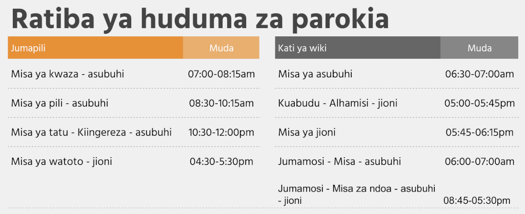 Ratiba hiyo imeandaliwa ili kuwasaidia waamini na wageni kufahamu kwa urahisi nyakati na mpangilio wa huduma zinazotolewa parokiani, na hivyo kushiriki kikamilifu katika maisha ya Kanisa.